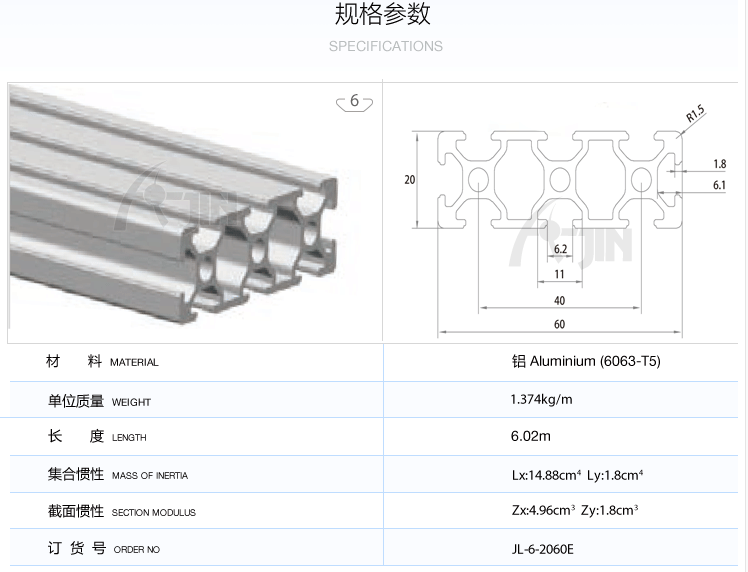 鋁型材2060E歐標(biāo)的貨號(hào):JL-6-2060E,有被稱作20*60歐標(biāo)型材,是一款屬于槽6系列的鋁合金型材。它的材料:鋁合金Material Aluminum(6063-T5),單位質(zhì)量Weight:1.37kg/m,長(zhǎng)度Length:6.01m,集合慣性 Mass of lnertia:lx:14.88 cm4 ly:1.8 cm4,截面慣性 Section modulus:Zx:4.96 cm3 Zy:1.8 cm3。