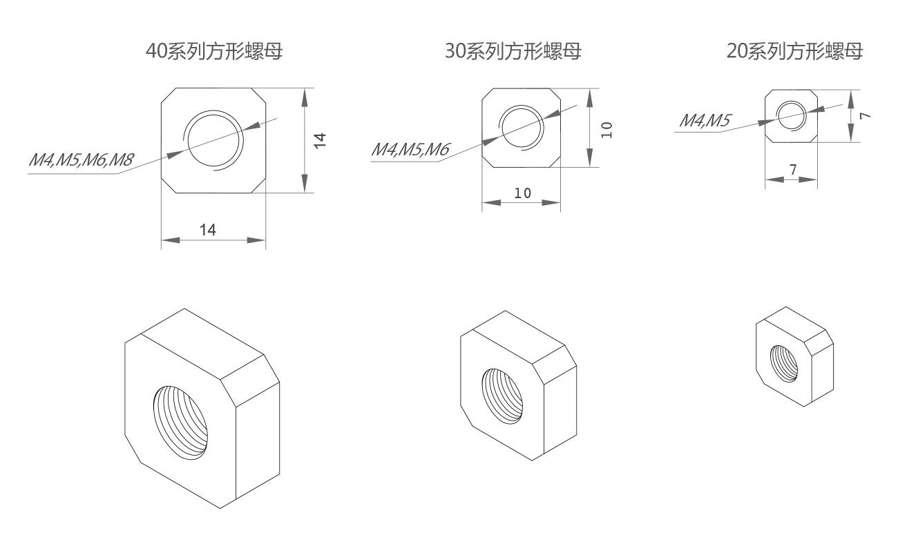方形螺母是國際型材的專用螺母,用在國際型材上連接各種配件,安裝時(shí)需要預(yù)先放進(jìn)型材的槽坑內(nèi)。